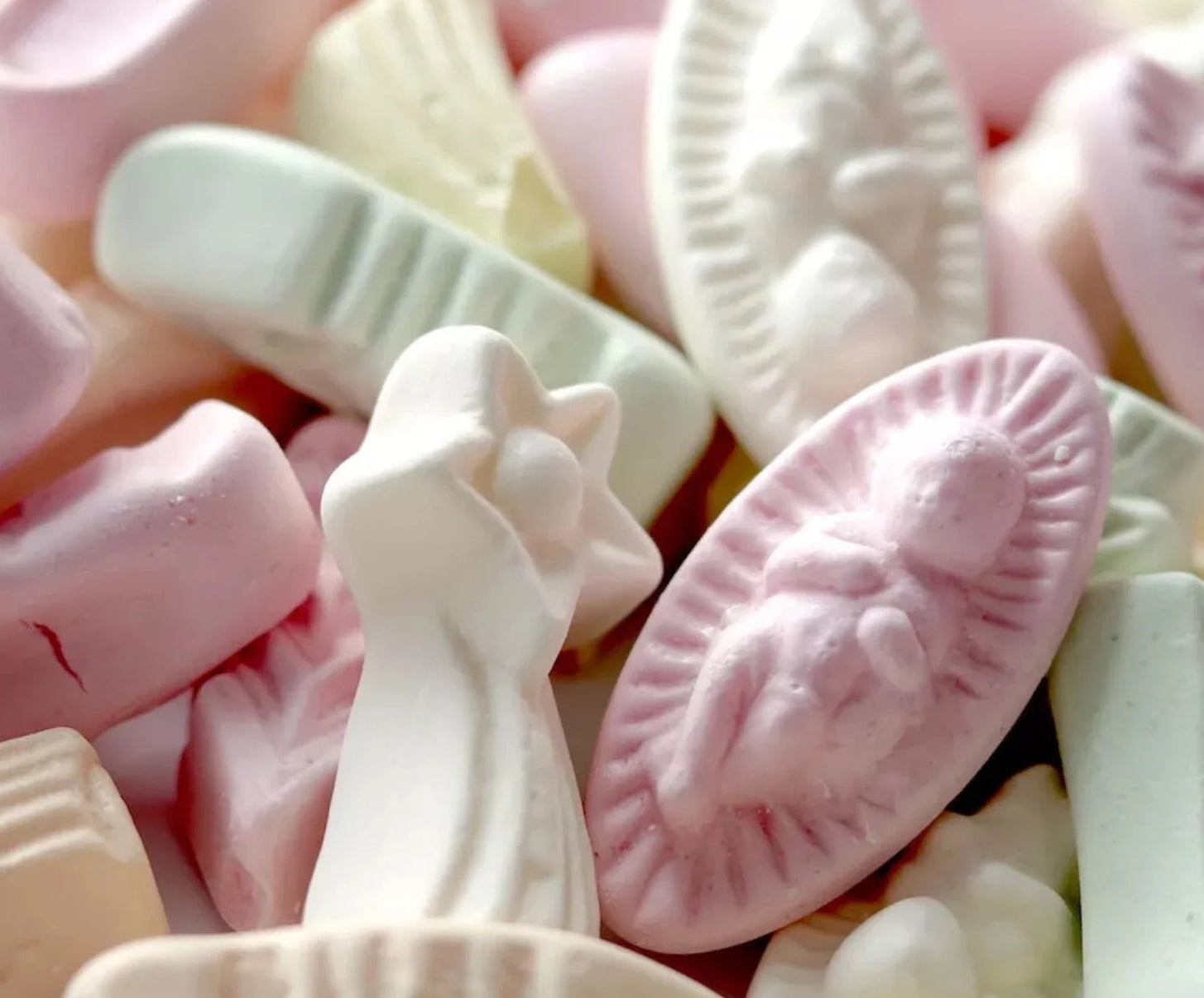 Ingrédients: Sucre, sirop de glucose, gélifiant : gélatine de porc, acidifiant : acide citrique, arômes, colorants : concentré de carthame, rouge de betterave, complexe cuivrique de chlorophyllines.