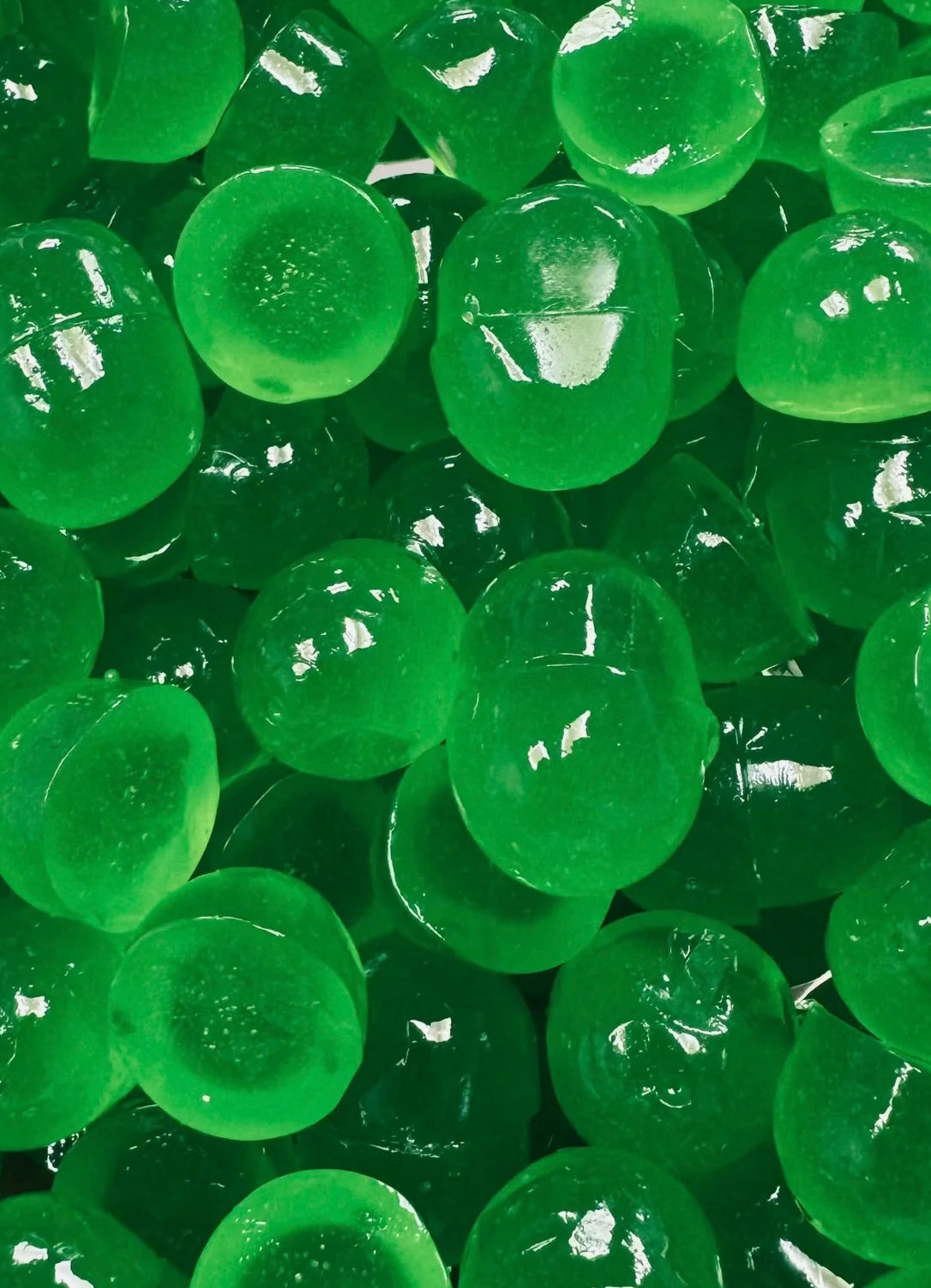 Ingrédients : Maltitols, eau, gélatine, acide citrique, pectine, arôme pomme, colorant (E102*, E131) agent d'enrobage : cire de carnauba.